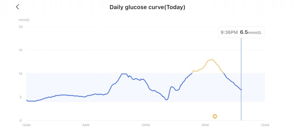 Time Glucose Level (mmol/L) Pre-meal baseline (~18:31–18:46) ~12.9–13 Post-meal start (~19:01) ~12.4 Decline phase (~20:56) ~7.7